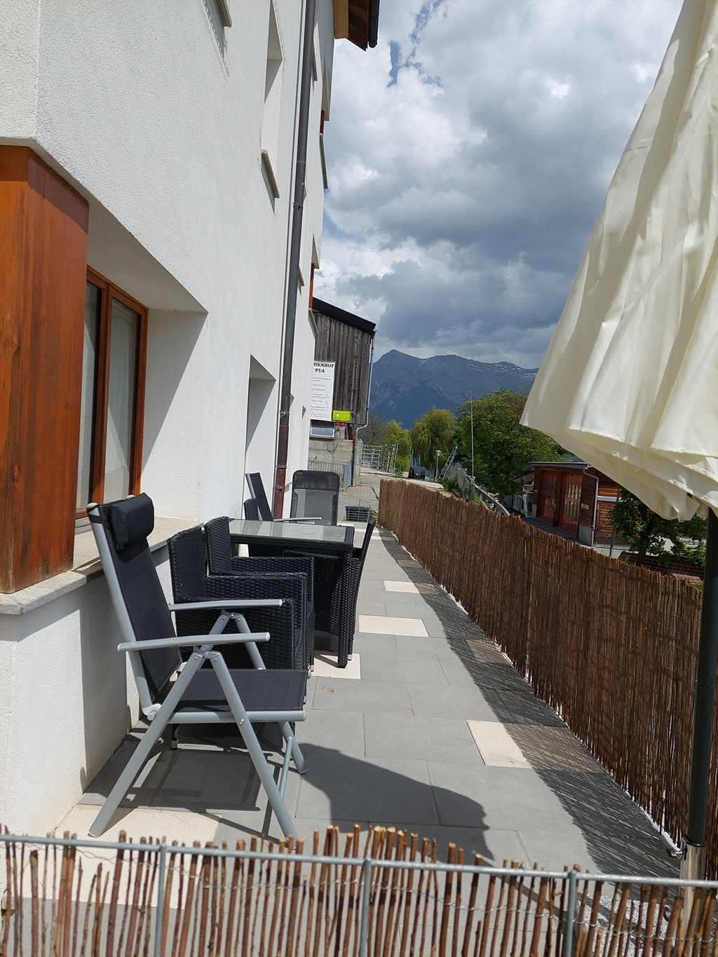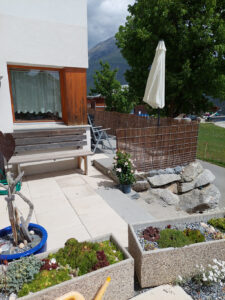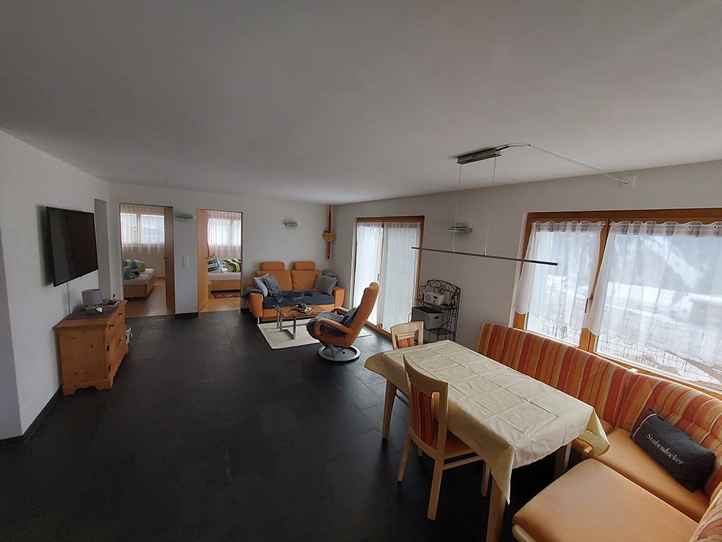 Grosse, helle und komfortable 3 ½**** Zimmer Ferienwohnung im Parterre für bis zu 4 Personen. Eigener Sitzplatz mit schöner Aussicht auf die Engadiner Bergwelt. Ausgestattet mit Gartenmöbeln und Sonnenschirm.